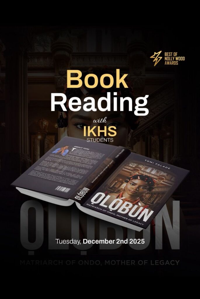 The event, which holds at 12:00 PM on Tuesday, December 2, will feature the reading of Tomi Falade’s book, a play titled ‘Olobun: Matriarch Of Ondo, Mother Of Legacy’.